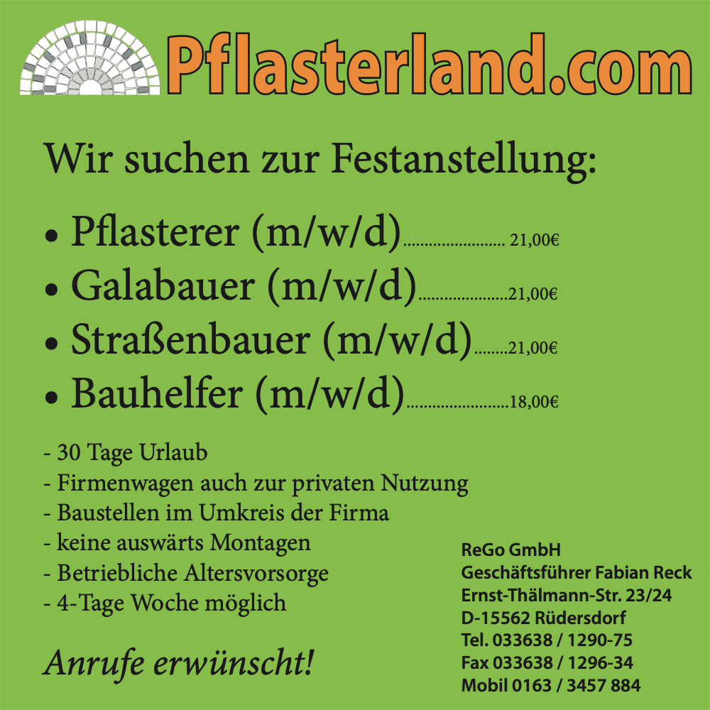 Pflastern, Gehwege, Einfahrten, Baumfällung, Grünpflege, Baugruben, Verfüllungen, Verdichtungen, Erdarbeiten, Bodenaustausch, Trockenbauarbeiten, Mauerwerkstrockenlegung, Abdichtung, Drainagen, Entwässerungssysteme, Abriss, Abbruch, Entsorgung, Beräumung, Mosaik, Fliesen, Containerdienst, Schüttgüter, Garten- und Landschaftsbau, Wegebau.